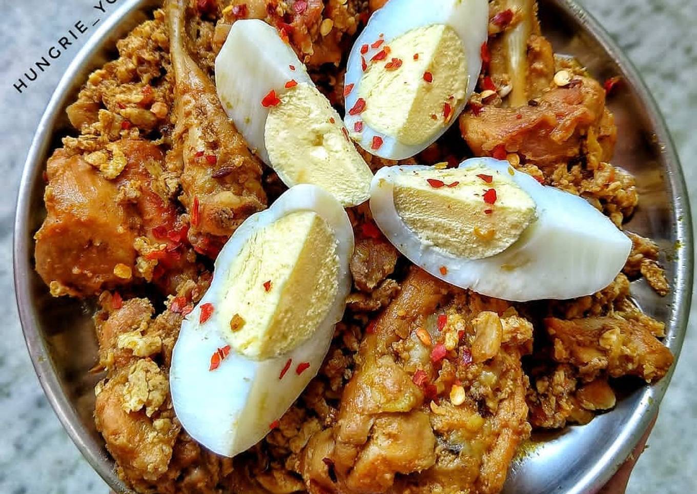 - Add 1 tbsp garam masala powder. And cover it up for 10 mins. Let the chicken cook in it's own juice. Add 2 small cups of water. And let it cook. After the chicken has soaked up most of the water and you can see the oil and gravy separating, add one raw egg and give it a stir. Add some salt to taste. Top it with a nicely cut boiled egg and serve 😋