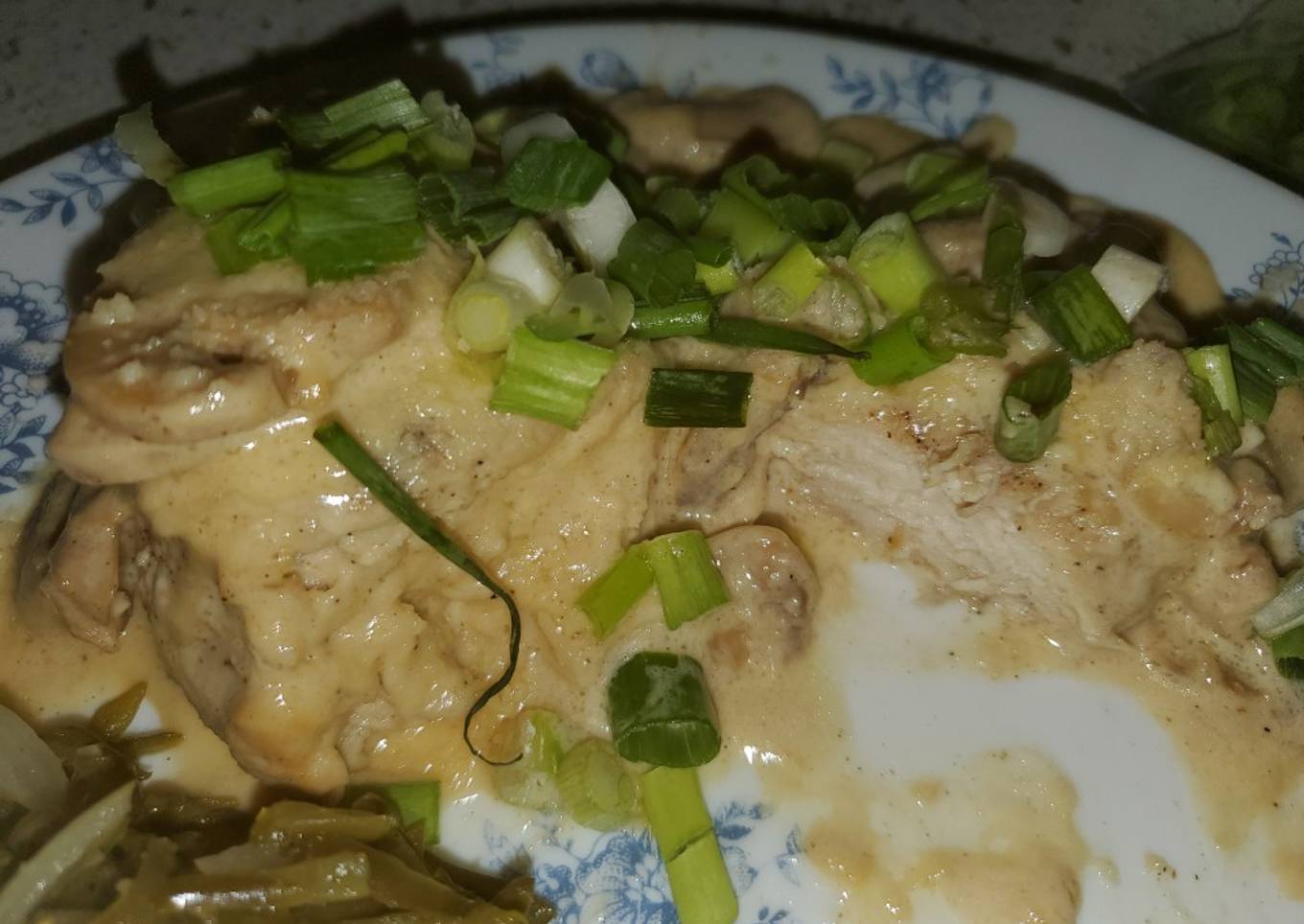 - Add the mushrooms, cream, garlic and lemon juice. Turn the heat to medium-low and cover skillet. Simmer for 20 to 30 minutes, turning the chicken occasionally, until the chicken is cooked through and the juices run clear.
