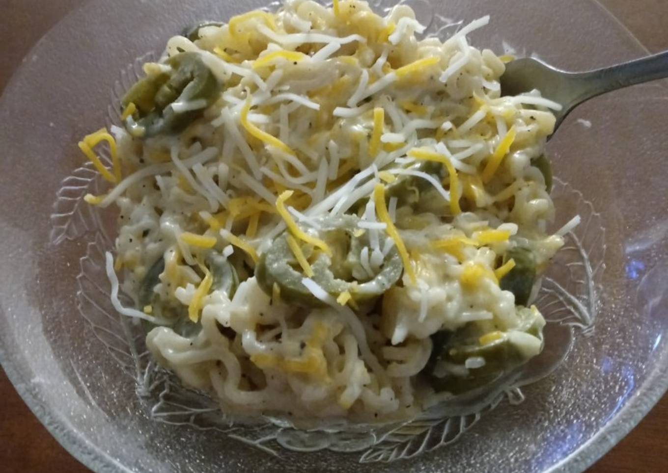 - Cook Ramen according to package directions reserving the seasoning packet. Once noodles are done and soft drain the water. Add seasoning packet, dash of black pepper, sliced jalapeños as many as you want, shredded cheese, and dressing. Mix til well combined and serve immediately and enjoy 😋.
