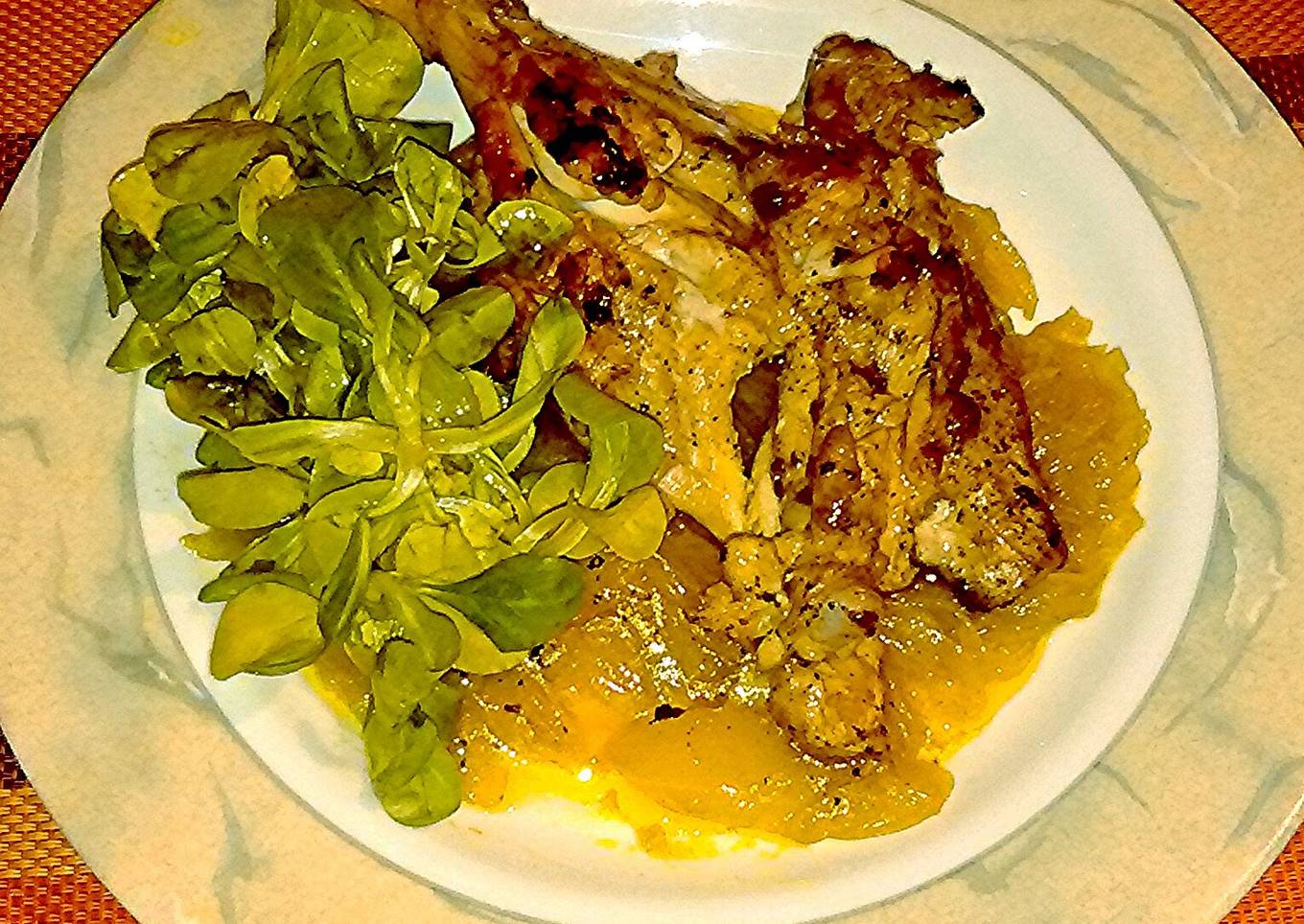 - Put the onions in the bittom of the dish, the leg on top and some green (I used lamb's lettuce)