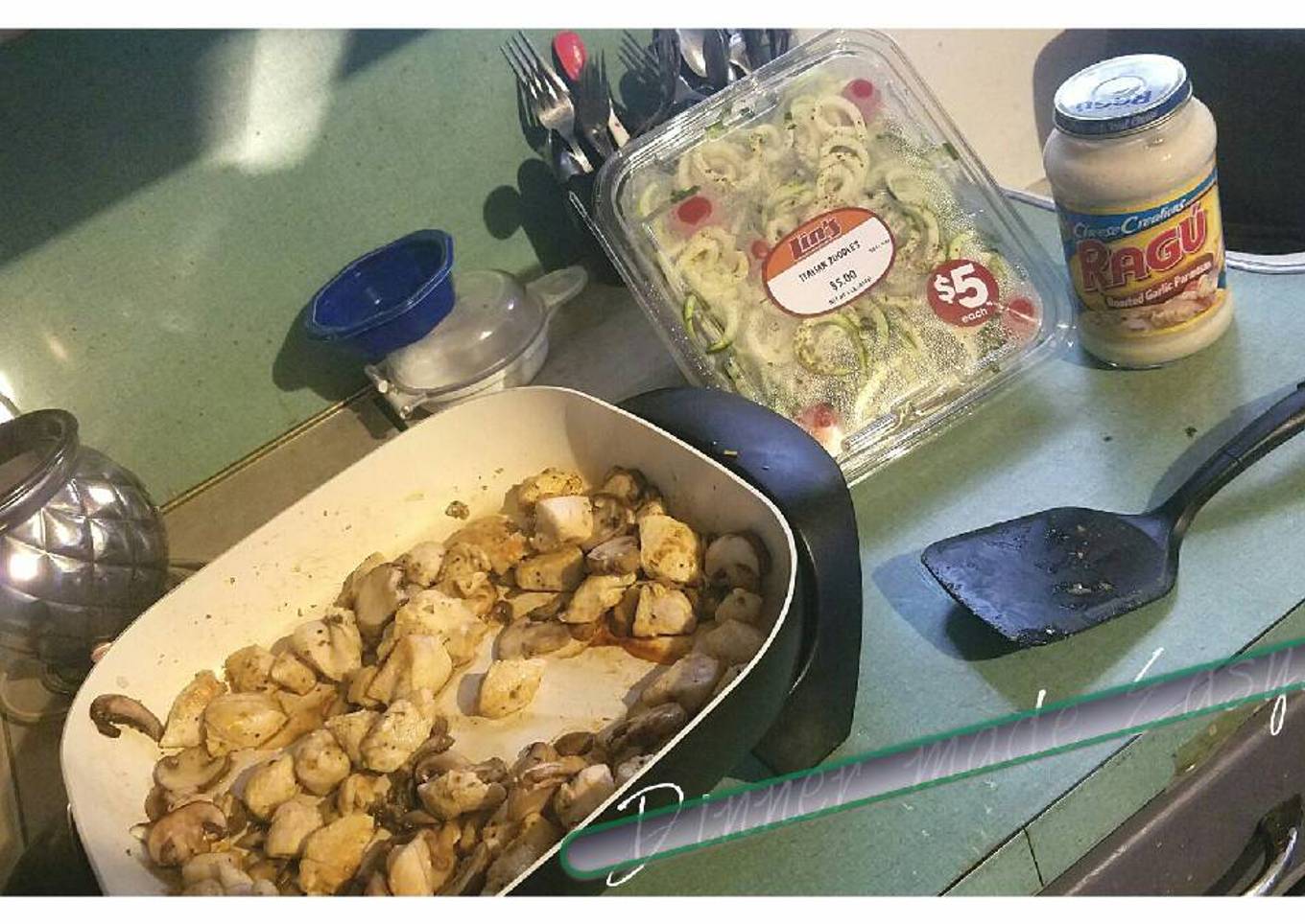 - Add your already cooked Chicken and bottle of Ragu Sauce with zoodles. Cover and simmer on low/med until hot.