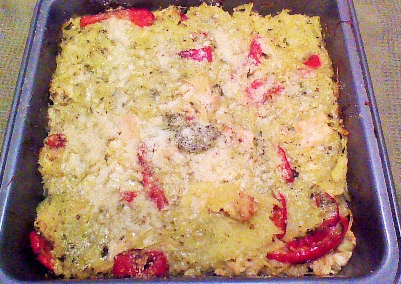 - Mix the Pesto sauce and pesto paste together. (I used the Market Side Cooking sauce - Basil pesto and Gourment Garden Basil paste in the fresh vegtable section from Wal-Mart) Add to the squash in baking pan. Add the chicken and red pepper to the squash. Mix all together. Top with parmesan cheese. Bake @ 350 for 30 min. Cool 5 min - Enjoy!